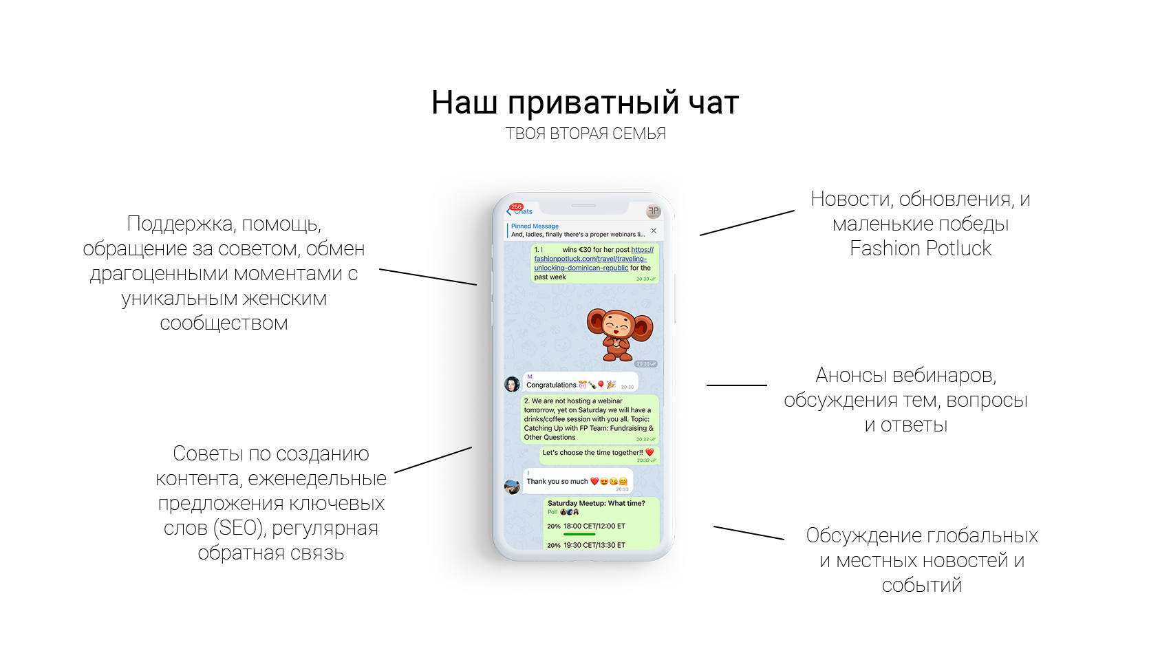 Еще одна ценность нашей подписки. Поскольку для нас важны сообщество и качественный нетворкинг, мы создали эксклюзивный женский чат для наших премиум-участниц, чтобы они могли взаимодействовать друг с другом, обмениваться новостями, обсуждать актуальные темы и поддерживать друг друга.✨